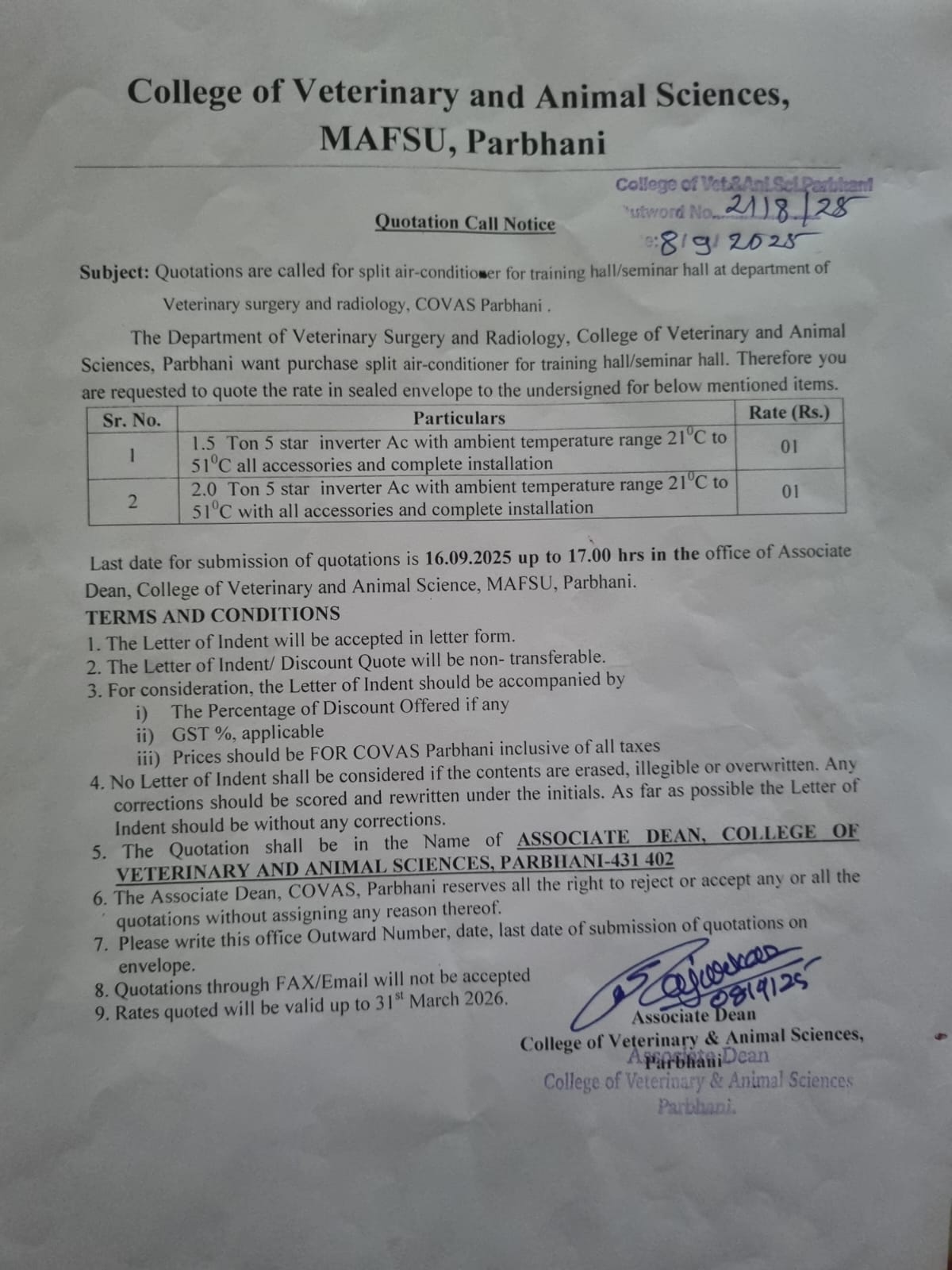 • Quotations are called for Supply of split air conditioner for Veterinary Surgery and Radiology under MAITRI at COVAS, Parbhani Click Here