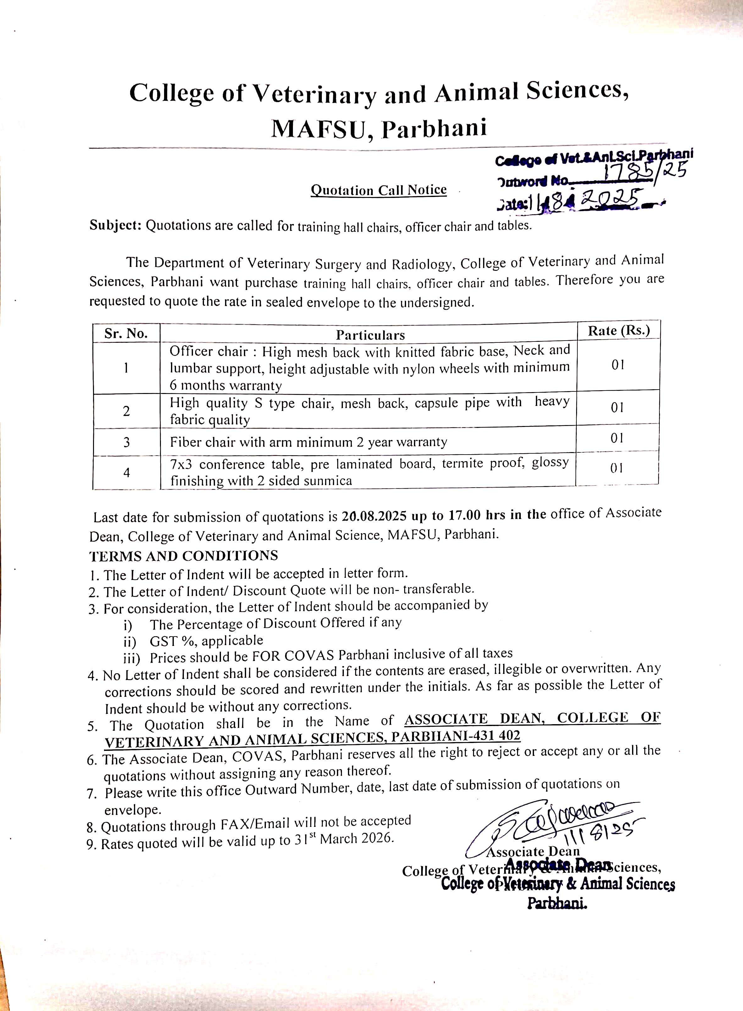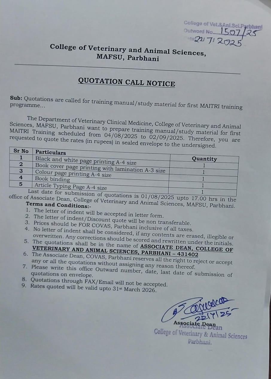 • Quotations are called for purchase of hiring food & catering services to the training Participants (Veterinarians and Para veterinarians in Animal Disease Control) under central Scheme of ASCAD at COVAS, Parbhani during April to May-2025 at Parbhani City Click Here