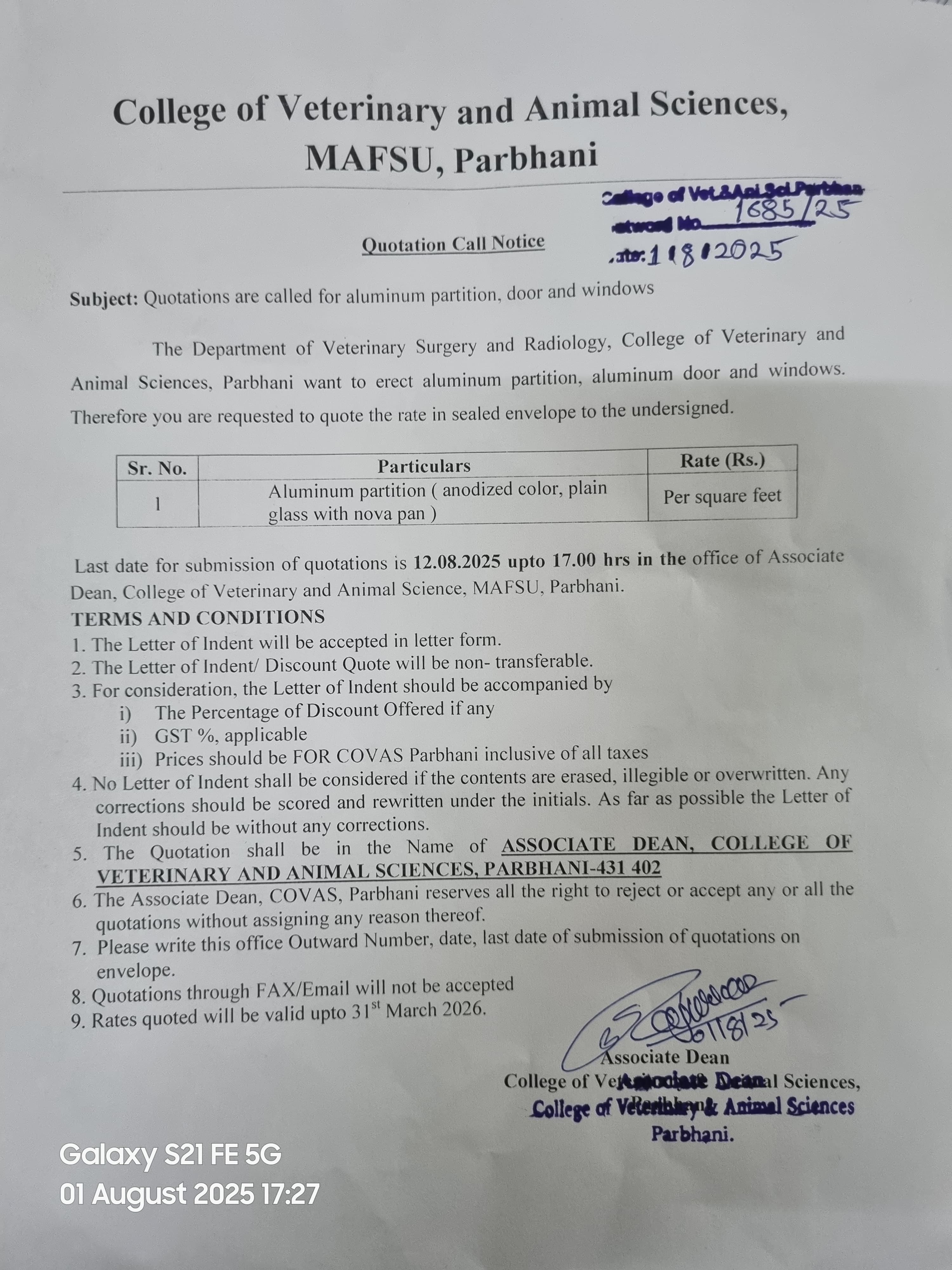 • Quotation calling notice for aluminum partition, door and windows for Department of Veterinary Surgery and Radiology, Parbhani. Click Here