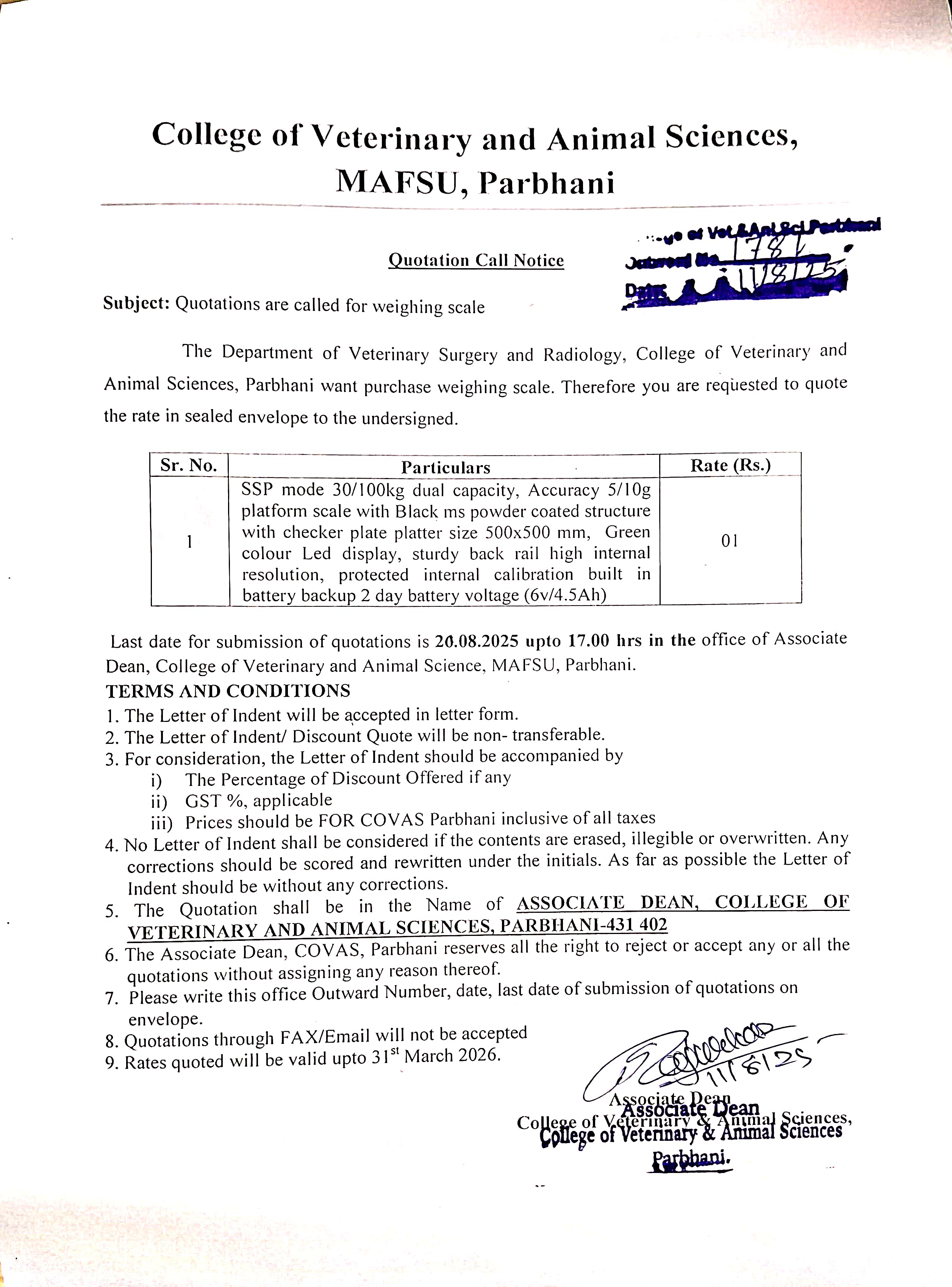 • Quotation calling notice for purchase of Weighing scale for covas Parbhani Click Here